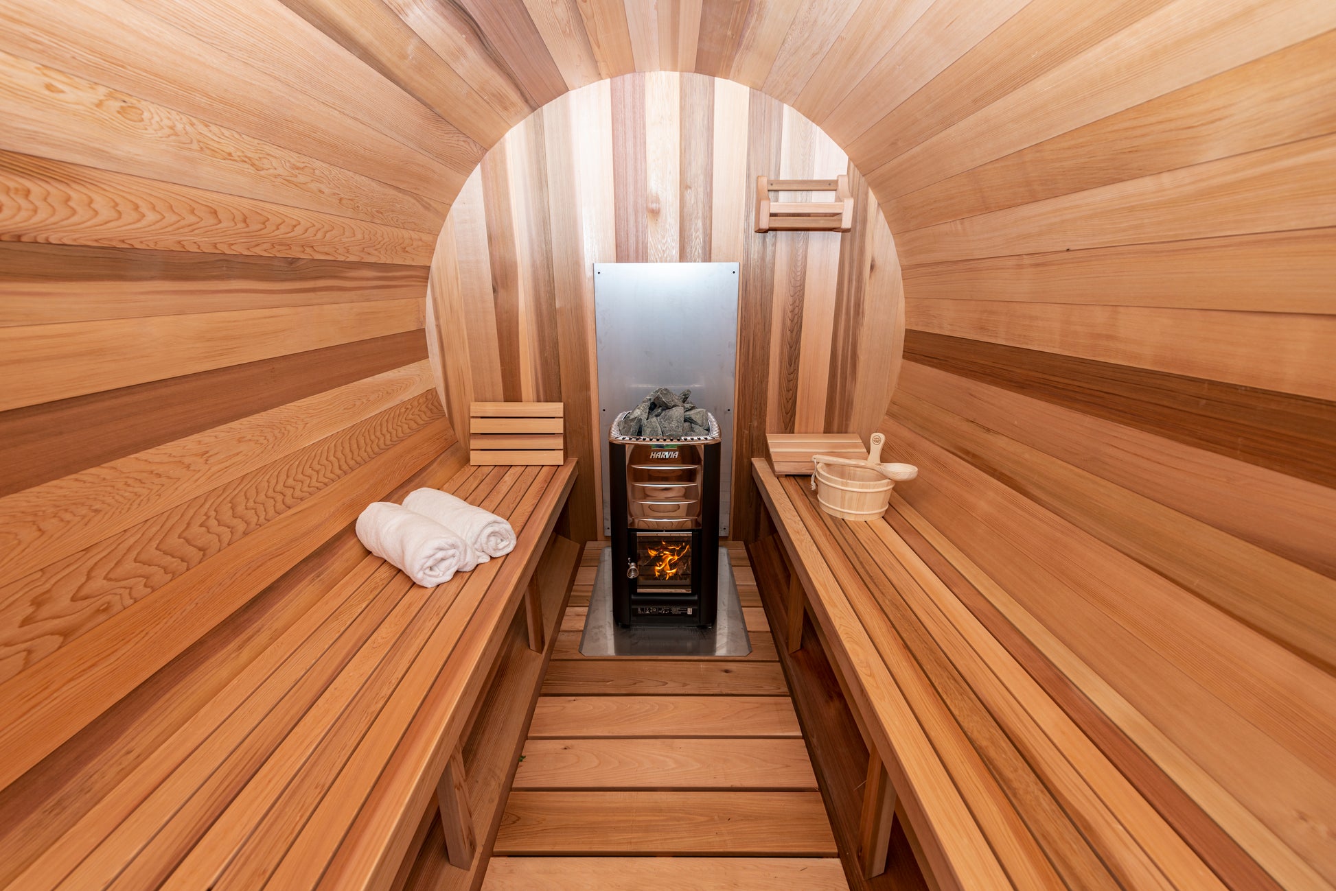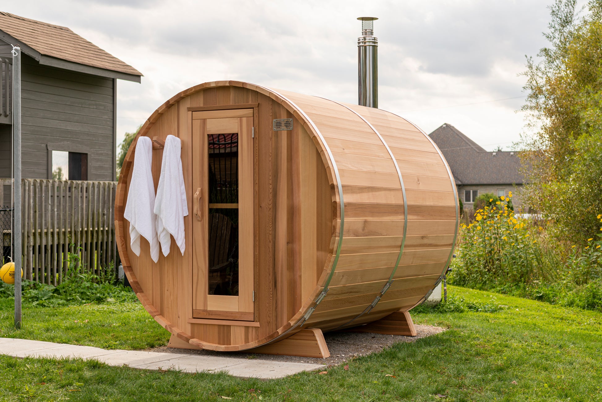 The Essential Amber Sauna brings together classic barrel design and the natural warmth of Canadian Knotty Cedar.